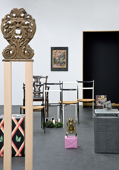 Objects from the MAK museum collection and personal collectibles adorned in honour of their makers. Decoration materials, wood, glass, watercolour, lacquer, metal, paper. Accompanied by a book listing these objects and their 'producers', 'authors', and 'sources'. Views from craftivism at MAK-Gallery, Vienna, 2012. Documentation by Katrin Wißkirchen, MAK